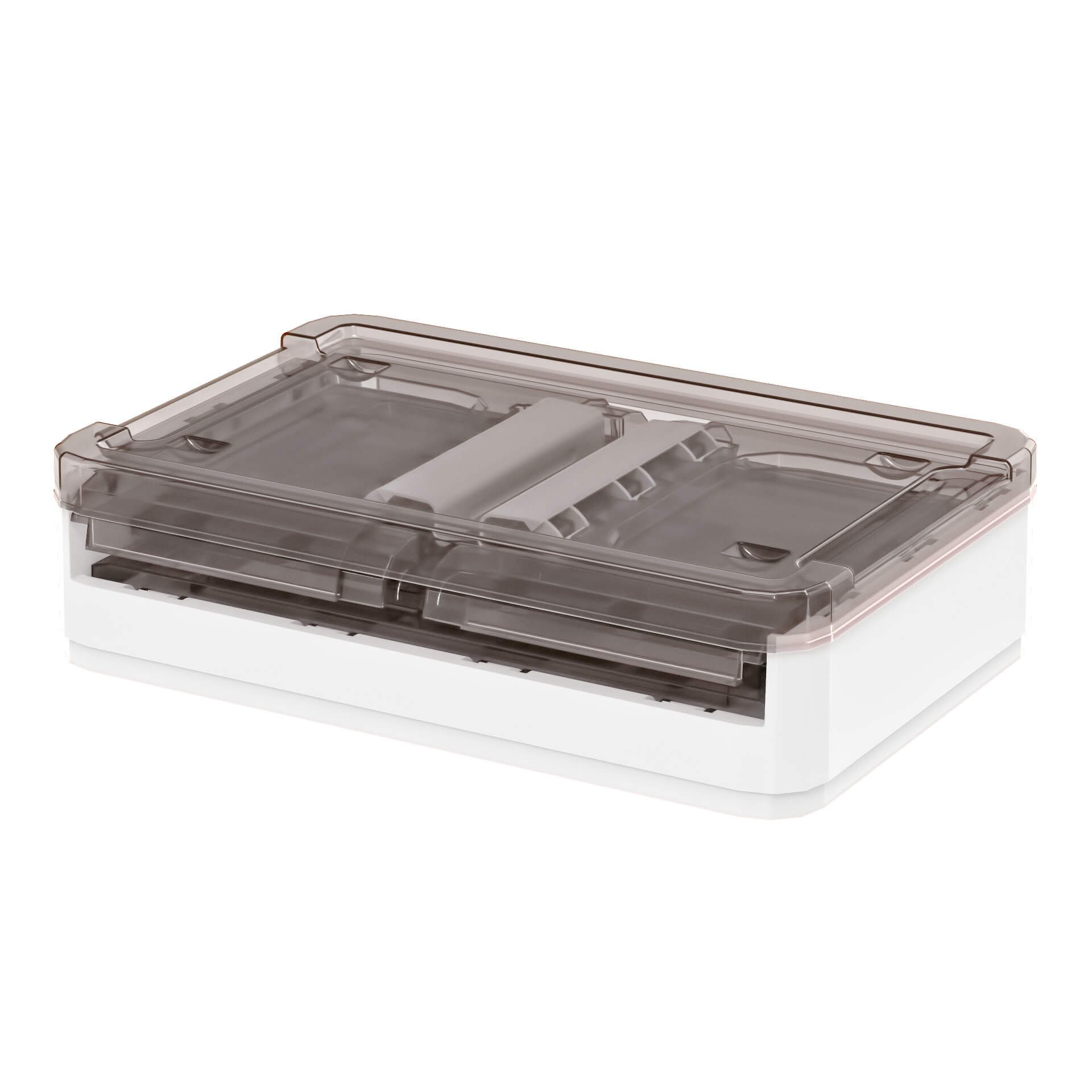Функциональный пластиковый складной ящик сочетает в себе элегантный дизайн, удобство и прочность. Прозрачные стенки с теплым коричневым оттенком создают стильный внешний вид и позволяют легко видеть содержимое, а белое дно добавляет аккуратности. Пластиковый контейнер идеально подходит для хранения одежды, игрушек, документов, бытовых принадлежностей и мелочей.