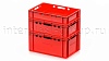 Изготовленный из первичного полиэтилена, контейнер соответствует санитарным требованиям и рассчитан на длительное использование. Возможность многократного оборота делает его практичным решением в категории многооборотная тара, а яркий красный цвет удобен для визуальной идентификации продукции и зонирования процессов на производстве и складе.